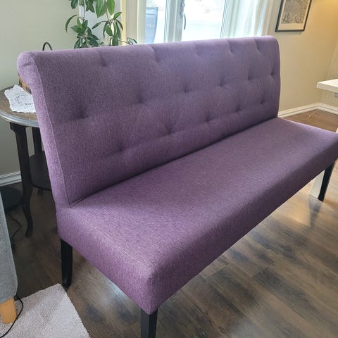 Stort og tungt massivt spisebord som var hånlaget en gang i tiden selges med en spise soffa og 3 stoler. Sofaen og stolene bærer litt preg av katt . Fremstår helt og pent uten om skadene på bilde. Trekkene på putene i sofaen kan taes av .