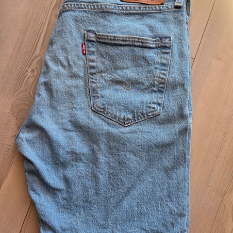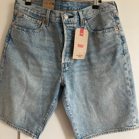 Levi's 505 herreshorts i blå denim i størrelse XL….men kanskje mer L enn XL. Shortsene er laget av denim og har klassisk 5-lommers design med gylf med glidelås og knapp i livet. Modellen har flere bevisste slitasjedetaljer og rifter i stoffet, noen med fôr i kontrastfarger. Helt ny.