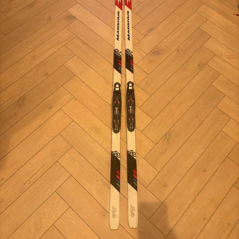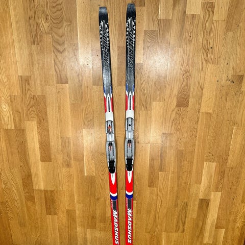 Madshus Terrasonic skøyteski med Rottefella NNN-binding. Kun brukt noen få ganger. Fargekombinasjon hovedsakelig rød, hvit og svart med grafiske detaljer.