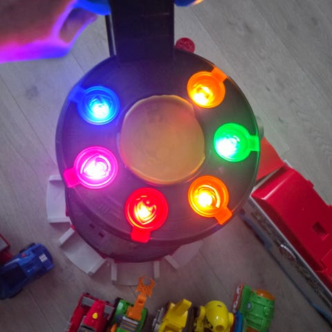 Paw Patrol lekesett bilbane med kjøretøy. Lekesettet består av en stor base i flere nivåer med utfellbare ramper og sider, samt et lite kjøretøy som kan plasseres og rulle langs banen. Fargene er hovedsakelig rød, svart, blå, grå og gul. Settet har ulike detaljer som lys og markeringer på banen, og flere rom og luker som kan åpnes. Lyd og lys fungerer feilfritt. Egnet som rollelek-leke for barn som liker Paw Patrol og kjøretøybaserte lekesett.