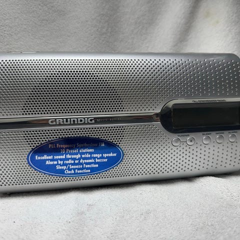 Grundig, Prima Boy, Prima Boy 100, PLL radio, FM radio, retro radio, vintage radio, bærbar radio, kjøkkenradio, hytteradio, 230V radio, batteriradio, C-batteri, analog lyd, minijack, sølv radio.