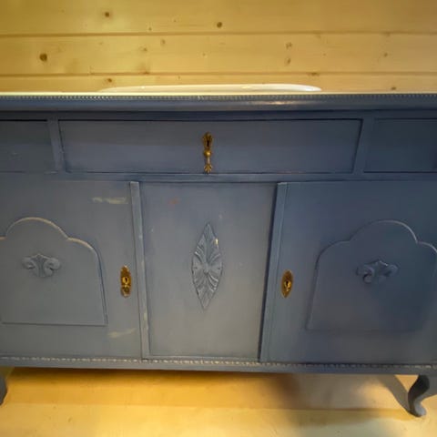 Fin og tung gammel skjenk med god plass. Kule detaljer. Løvepoter og skuffer, samt pynt på midterste dør. Knapper kan byttes på. Noen små skader.
