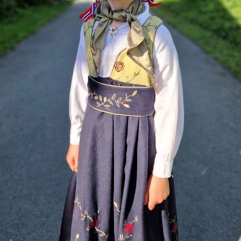 Den fineste festdrakten etter min mening! Hel nydelig farge og av god kvalitet. Romslig i størrelsen.