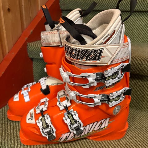 Tecnica alpinstøvler i oransje med hvitt innerfôr. Støvlene har fire justerbare spenner i metall og kraftig powerstrap øverst for god tilpasning rundt leggen. Passer til vanlig alpinbruk.