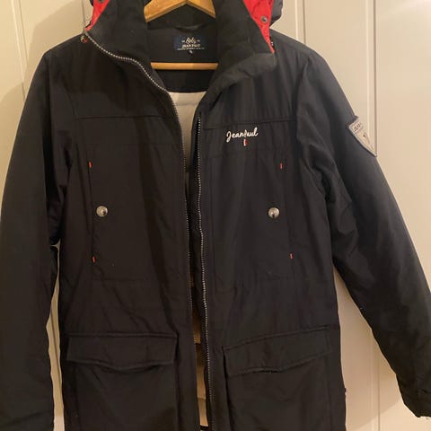 Jean Paul dunjakke for dame i størrelse S. Jakken er blå og har vattert, quiltet mønster. Fylt med dun for isolasjon og varme. Lukkes med trykknapper foran og høy krage med knappedetaljer.