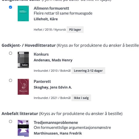 Selger samling av lærebøker i rettsvitenskap. Bøkene dekker ulike emner innen juridiske fag, blant annet tingsrett, pengekravsrett, obligasjonsrett forvaltningsrett og andre sentrale rettsområder.