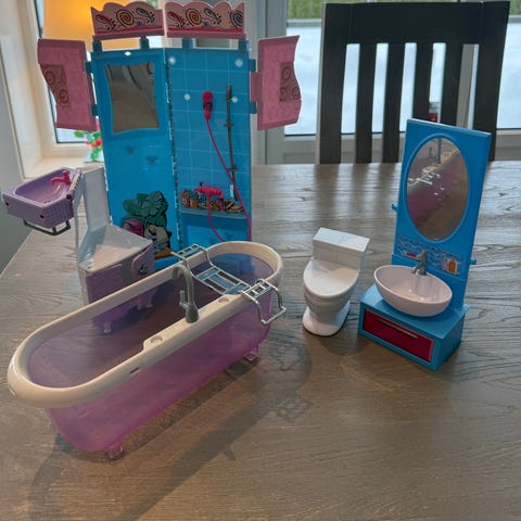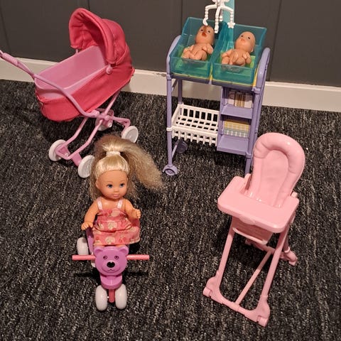 Selger noen møbler som kan brukes som babyutstyr til Barbie, men de er litt større i forhold til original skala. Møblene er godt brukt, men mye bruk igjen.