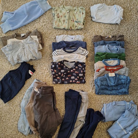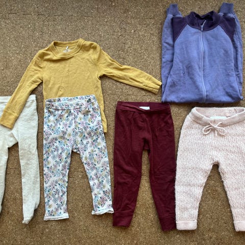 3 nattas,4 genser,3 bukser,3 bodyer og 3 par med sokker.Alt i ull.Kun vasket med ull program.Det er litt nupper på den eine nattasen.Og noe flekker på den eine bodyen.Ellers er alt fint.Kan sende☺️