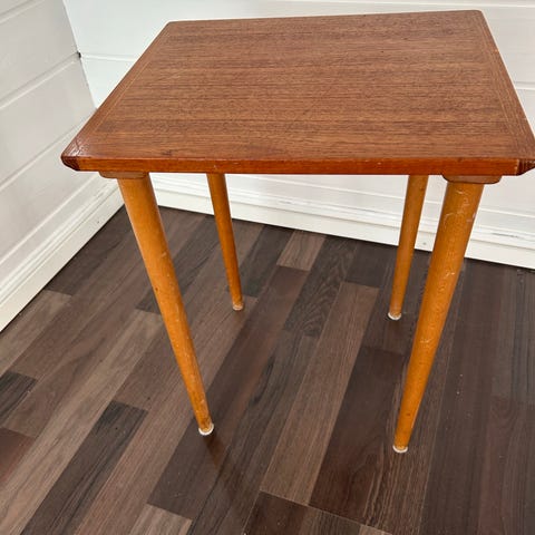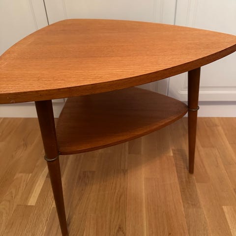 Stilig retro salongbord arvet fra familien. Bordet har et klassisk nordisk uttrykk med avrundede kanter og varme tretoner. Perfekt som sidebord, kaffebord eller som et lite blikkfang i stua.