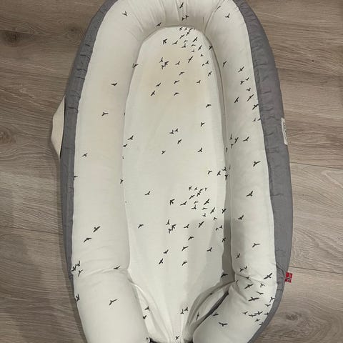 Voksi babynest i grå farge med lys innermadrass med lite mønster. Babynestet har myke, polstrede kanter rundt liggeflaten og bærehåndtak på sidene. Ytterstoff og innermadrass er i tekstil, og bunnen er polstret for å gi en jevn liggeflate. Egner seg til bruk for spedbarn som en avgrenset og lun sove- og hvileplass. Bruksanvisning med illustrasjoner er festet på undersiden av babynestet.