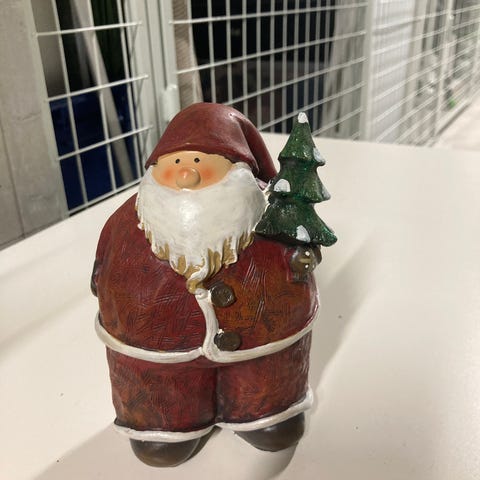 Julefigur nisse lyslykt i keramikk. Nisse med langt skjegg, rød lue og grå kappe.