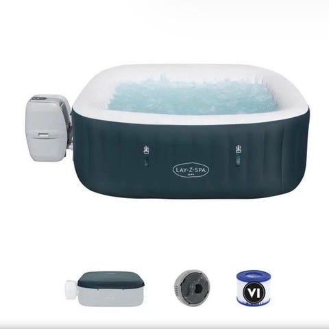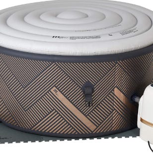 Oppblåsbart boblebad i rektangulær form i grå og hvit farge. Badet har oppblåsbare vegger og kant, og leveres med separat oppblåsbart lokk. Egnet for bruk utendørs eller innendørs der det er tilrettelagt for vann og avløp. Materialet er typisk slitesterk PVC eller lignende plastmateriale beregnet for vann og utendørsbruk. Boblebadet passer til avslapning og bading for flere personer, avhengig av størrelse og vannkapasitet. Det kan tømmes og pakkes sammen for lagring når det ikke er i bruk.