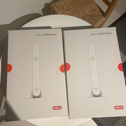 Altibox WiFi-forsterker i hvit utførelse. Enheten kobles til eksisterende Altibox-utstyr for å utvide trådløst nettverk i bolig. Produktet kan brukes som aksesspunkt eller WiFi-repeater, avhengig av oppsett. Pakken inneholder WiFi-enhet, strømadapter og bordstativ. Egnet for innendørs bruk der det er behov for bedre trådløs dekning fra Altibox-nettverk.