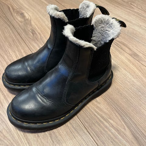 Dr. Martens støvler i størrelse 40. Modellen er en ankelhøy Chelsea støvel med elastiske felt på sidene og hempe bak for enklere av- og påkledning. Støvlene er laget i svart skinn med gummisåle.