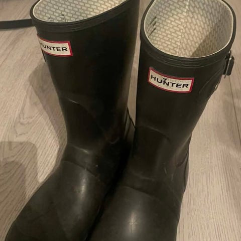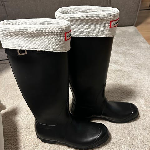 Hunter regnstøvler. Høye gummistøvler i svart med justerbar rem øverst på skaftet. Klassisk modell med logo foran. Størrelse 40 (små i størrelsen, bruker til vanlig størrelse 38-39)