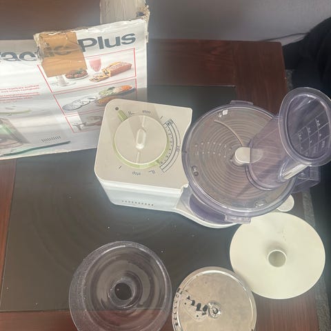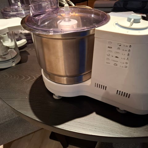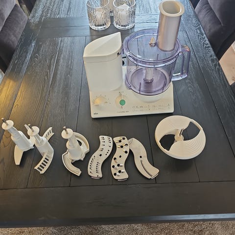 Braun kjøkkenmaskin med bolle i plast og flere utskiftbare skiver og kniver. Maskinen har transparent bolle med lokk og materør, samt kontrollpanel med ulike funksjonssymboler for bearbeiding av mat. Medfølgende tilbehør inkluderer blant annet riv- og skjæreskiver, eltekrok og vispetilbehør, egnet for hakking, riving, skiving, elting og visping av ulike råvarer. Egnet til generell matforberedelse på kjøkkenet.