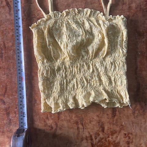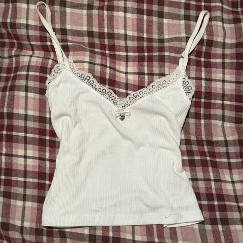Bik Bok singlet for dame i størrelse S. Singleten er lilla og laget av bomull med ribbestruktur. Den har tynne stropper og v-utringning, med blondekant øverst. Passer som topp til hverdagsbruk eller under andre plagg.