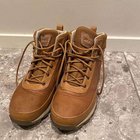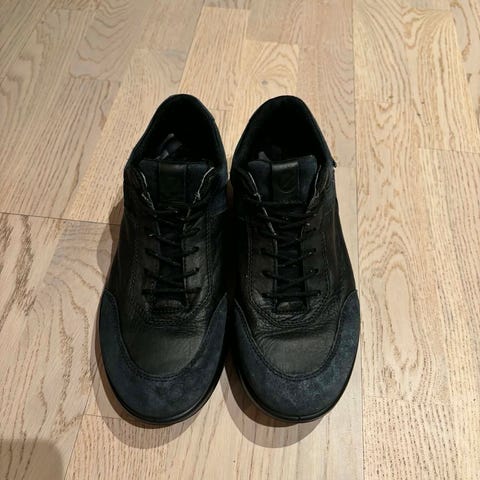 Ecco sneakers herresko i størrelse 41. Modellen er en ankelhøy fritidssko med snøring. Skoene er i brunt skinn med tekstildetaljer og gummisåle. Nøytral farge som passer til hverdagsbruk og fritid. Passer til voksen størrelse 41. Svært lite brukt.