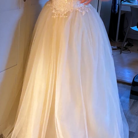 Beige/lys rosa kjole er merket med 32 inni og passer nok XS til M. Den har knytting bak for justering. Kr 1200