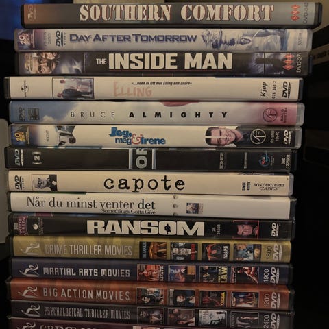 Samling med ulike DVD og Blu-ray filmer. Filmene står i standard DVD-covere og er beregnet for avspilling på DVD-Bluray spillere.