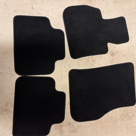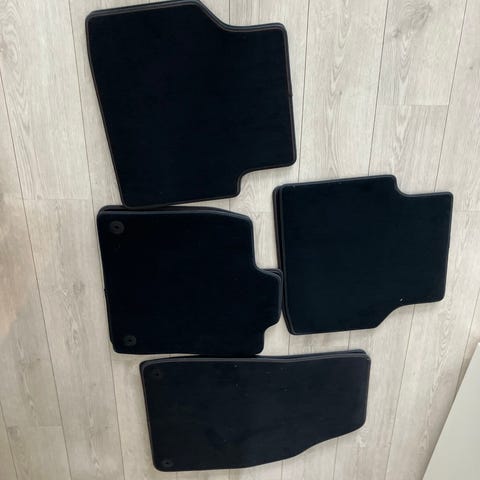 Sett med gulvmatter til bil i svart tekstil. Består av tre matter til kupé, inkludert matter til forseter og baksete. Utformet for å dekke gulvet foran og bak i bilen og beskytte mot smuss og slitasje.