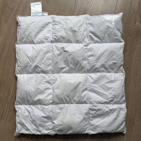 Vega gåsedun dyne baby 65x80 cm, fra Kid. Trekk 100% bomull, fyll 80% hvit gåsedun og 20% gåsefjær. Denne har 4x3 lommer, se bilde. Selges for 250 kr stykket.