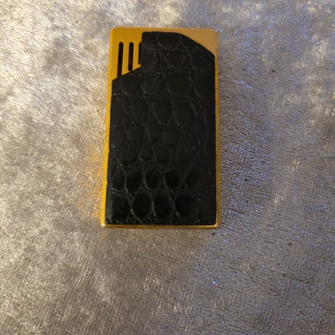 Lighteren har et avlangt, rektangulært design med mørk brun overflate og lyse linjer langs sidene. Metallfarget topp og bunn.
