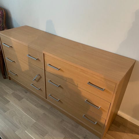 Kommoden er pent brukt. Ingen ytre skader. I et par av skuffene er bunnen presset litt ned. Lett å fikse.