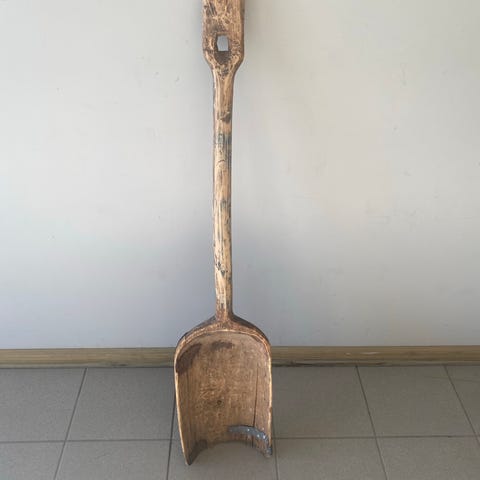 Selger en gammel bakespade, laget av et helt stykke tre. Lengde 111,5 cm.