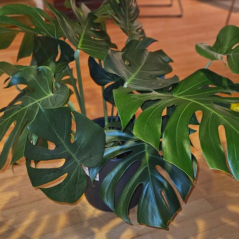 Stor monstera har hatt den siden den var veldig liten. Har vært frisk og rask til nå, begynt å bli brun på noen av bladene. Kan vær pga for mye sol.