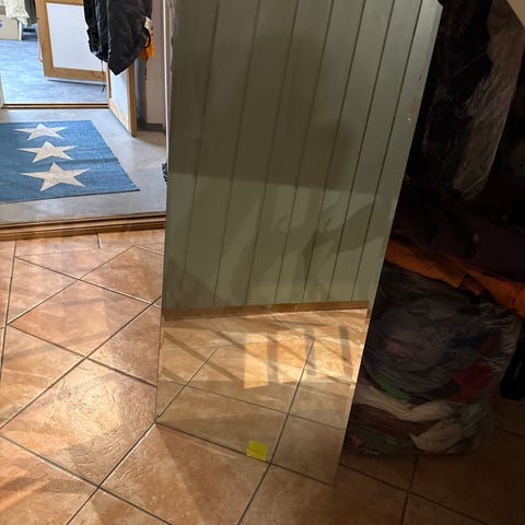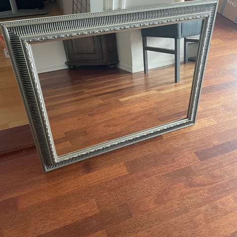 speil med dekorativ sølvfarget ramme. Rammen har profilert kant med perle- og tvunnet mønster. Speilet ble kjøpt billig pga en sprekk/skade på én side, men det er ikke veldig sjenerende. Gis derfor bort.