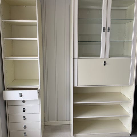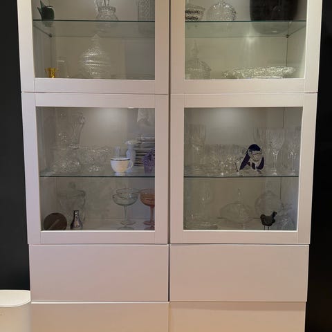 Vitrineskap fra Ikea. Bredde 120cm, høyde 202cm og dybde 40cm. Liten skade nederst på venstre dør, se bilde. Er ikke demontert.