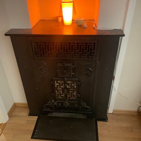 Frittstående vedovn i svart metall. Ovnen har rund form med konisk topp og står på fire ben.
