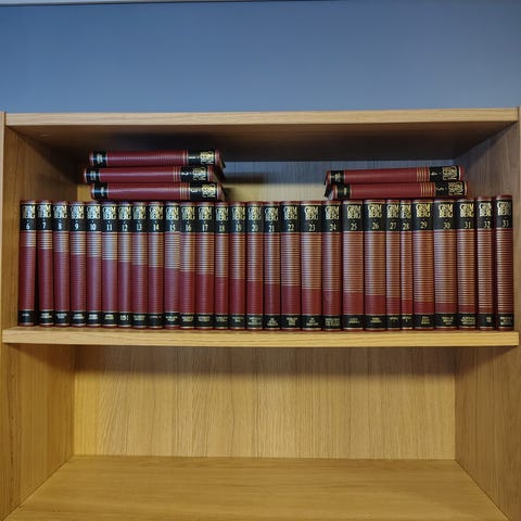 Boklot med diverse skjønnlitterære bøker og krimromaner i blandede serier. Bildene viser blant annet serier med klassiske romaner i mørke skinn- eller skinnimitasjonsbind, en serie bøker av Theresa Charles, en serie bøker av Bagley samt flere krimromaner av Henning Mankell. Bøkene står i bokhyller og omfatter innbundne bøker. Egner seg for lesere som ønsker et variert utvalg skjønnlitteratur og krim samlet i én pakke. Flotte bøker å ha i bokhylla. Bøker fra 10 kr pr bok