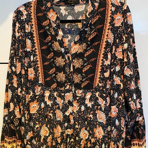 Fin Kjole/tunika fra danske Moliin. Størrelsen er Large, men heller mot Medium. Kjolen er flerfarget med mørk bunn og blomstrete mønster. Modellen har løs passform, lange ermer med knapp ved mansjetten og rund hals med åpning og knyting foran. Stoffet virker lett og luftig, egnet som hverdagskjole og til festlige anledninger.
