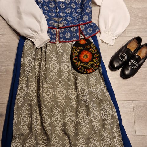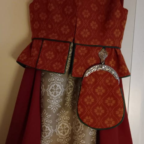 Ubetydelig brukt Rød Trønderbunad med alt utstyr, sydd på Husfliden i Trondheim, ca str., M/40, selges med sølv, sko i ekte skinn, underskjørt, festskjorte i lin, knestrømper og ny strømpebukse.