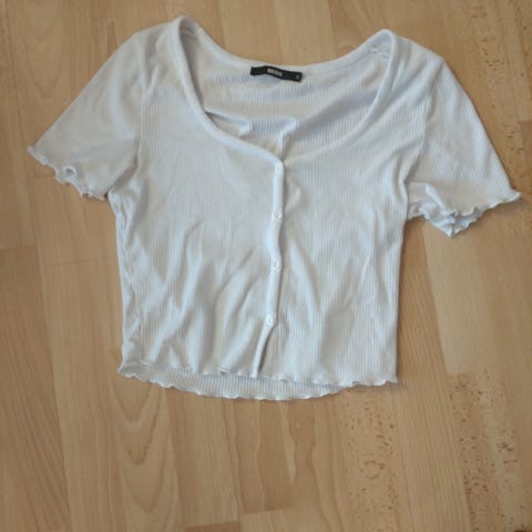 H&M Divided topp for dame i størrelse S. Topp i hvit, ribbestrikket bomull med korte ermer. V-utringning med blondekant foran og langs halsen. Lett cropped lengde med bølgekant nederst på ermene og i livet. Egner seg til hverdagsbruk og kan kombineres med både bukser og skjørt.