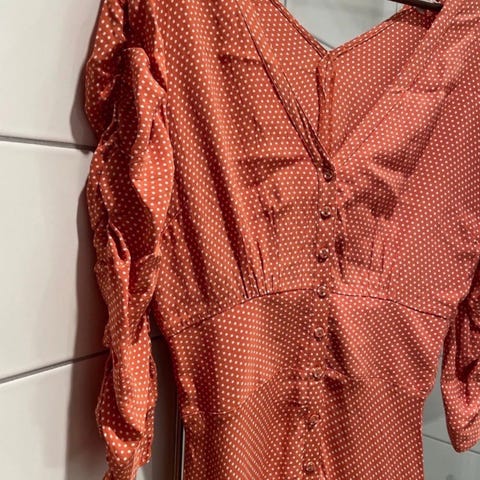 byTiMo sommerkjole i størrelse M for dame. Lang kjole i viskose med flerfarget blomsterprint i rosa- og rødtone på lys bunn. Kjolen har lange ermer med volum, knappestolpe foran og avtagbart belte i livet med beltespenne. Stoffet er lett og semitransparent i overflaten, med underkjole for dekning. Passer til bruk på varme dager, ferie og hverdagsbruk der en luftig sommerkjole er ønsket. #bytimo #kjole