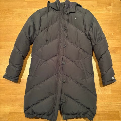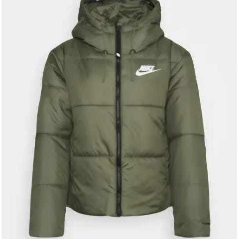 Nike kåpe for dame i størrelse M. Kåpen er grønn og har hette. Den har glidelåslukking foran og lengre passform som dekker godt nedover lårene. Nike-logo er plassert på brystet og på ryggen. Jakken kan vrenges og brukes på begge sidene.