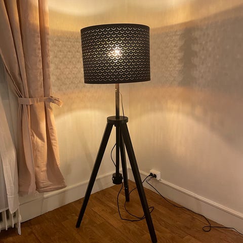 Pent brukt, helt i orden. Mørk brun/messing. Få/ingen bruksmerker. Det følger med skjerm (varm beige). Kan hentes på Blommenholm. 140 cm (uten skjerm) på bildet, høyde kan justeres.
