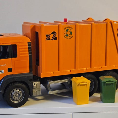 Bruder MAN søppelbil lekebil i oransje plast.