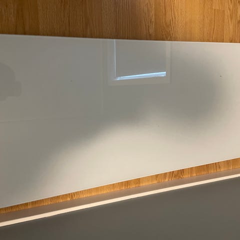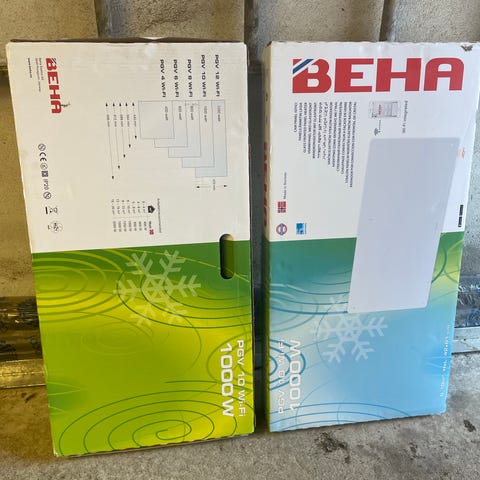 BEHA PG10 panelovn på 1000W med hvit glassfront. Ovnen har elektronisk termostat med temperaturinnstilling og av/på-bryter på toppen under plastdeksel. Veggfeste som vist på bildene følger med.