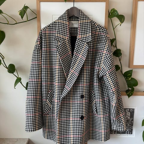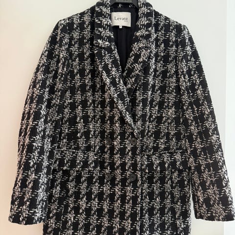 Anine Bing blazer for dame i størrelse L. Blazeren er beige med rutete mønster og er laget hovedsakelig av polyester med litt ull. Klassisk dobbeltspent front med slag og lommer foran. Passer til bruk både til hverdags og mer formelle anledninger.