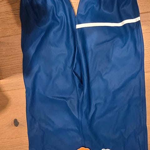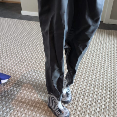 Utrolig praktisk regnbukse der støvelen sitter fast i skoene. Pent brukt.