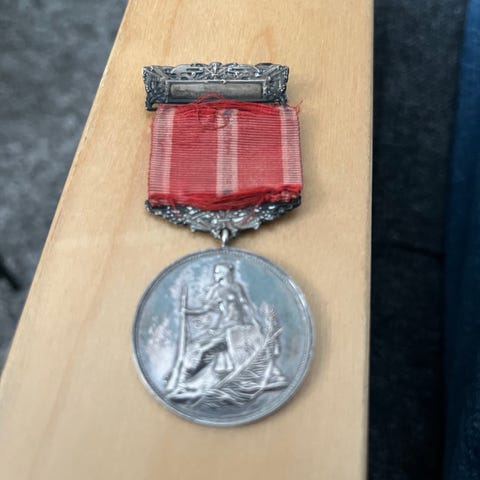 Skyttermedaljen "Skarp skytte" ble utdelt i tidsrommet 1886 til 1910 til de som bestod skytterprøven. Medaljen har en viss patina, men framsiden er pen, og kan trolig bli penere med forsiktig rensing- noe jeg ikke har gjort.