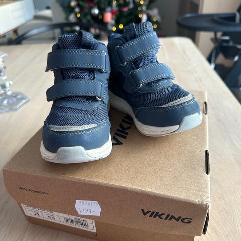 Viking joggesko for barn i størrelse 28, unisex. Skoene har høyt skaft med kombinasjon av lisser og borrelås for god passform. Overdelen er i mørk tekstil og syntetisk materiale, med lys såle. Egnet som hverdagssko for barn, både inne og ute, i overgangssesonger og mildere vær.
