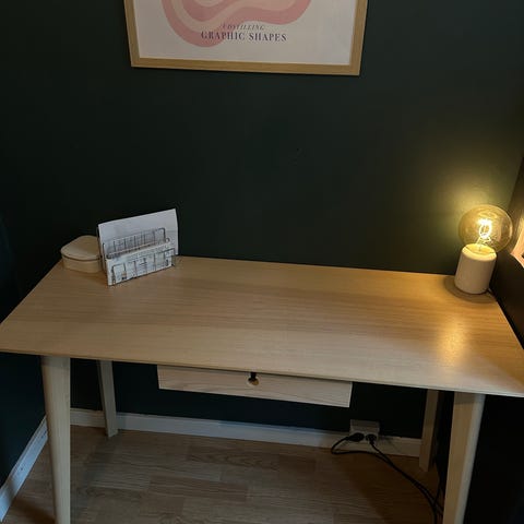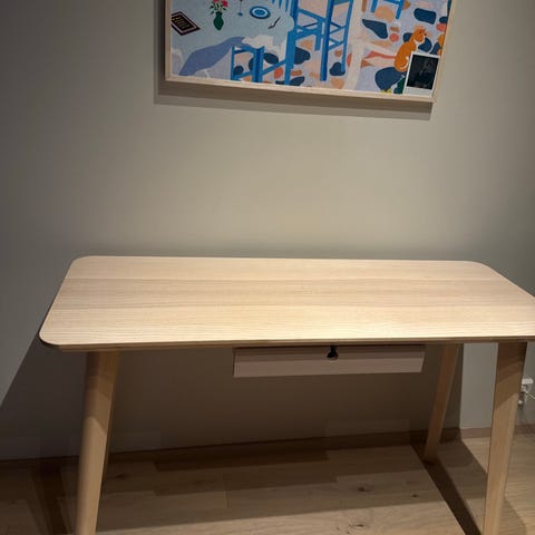 IKEA Lisabo skrivebord i lyst tre med rektangulær bordplate og én sentrert skuff under platen. Bordet har fire ben i tre som monteres på undersiden av bordplaten. Overflaten har synlig trestruktur i lys naturfarge. Egnet som skrivebord eller arbeidsbord i hjemmekontor, stue eller soverom.