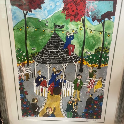 Kari Torsvik veggteppe i tekstil, signert og datert «80» på baksiden. Veggteppet er satt sammen av applikerte stoffbiter i ulike farger og mønstre, med quiltede sømmer som holder lagene sammen. Motiv med flere figurer i kostymer foran buer/arkader, utført i et dekorativt og detaljert uttrykk. Egnet som veggdekor i stue, gang eller andre oppholdsrom der man ønsker et større tekstilt kunstverk.