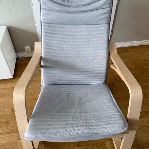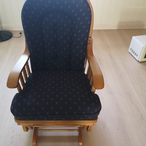 Veldig pent brukt gyngestol med puff som har mange år igjen. Ene feste på ryggen har revnet, men er enkelt å sy på plass. Må hentes.