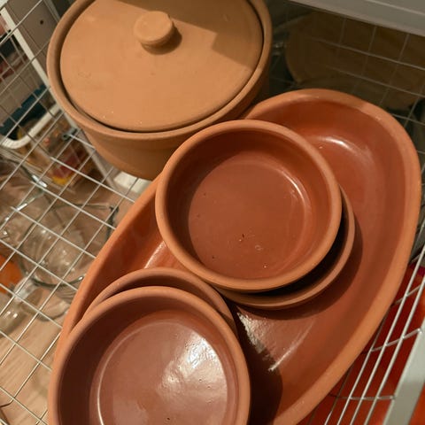 Signert keramikk servise blå og terrakotta dekorert